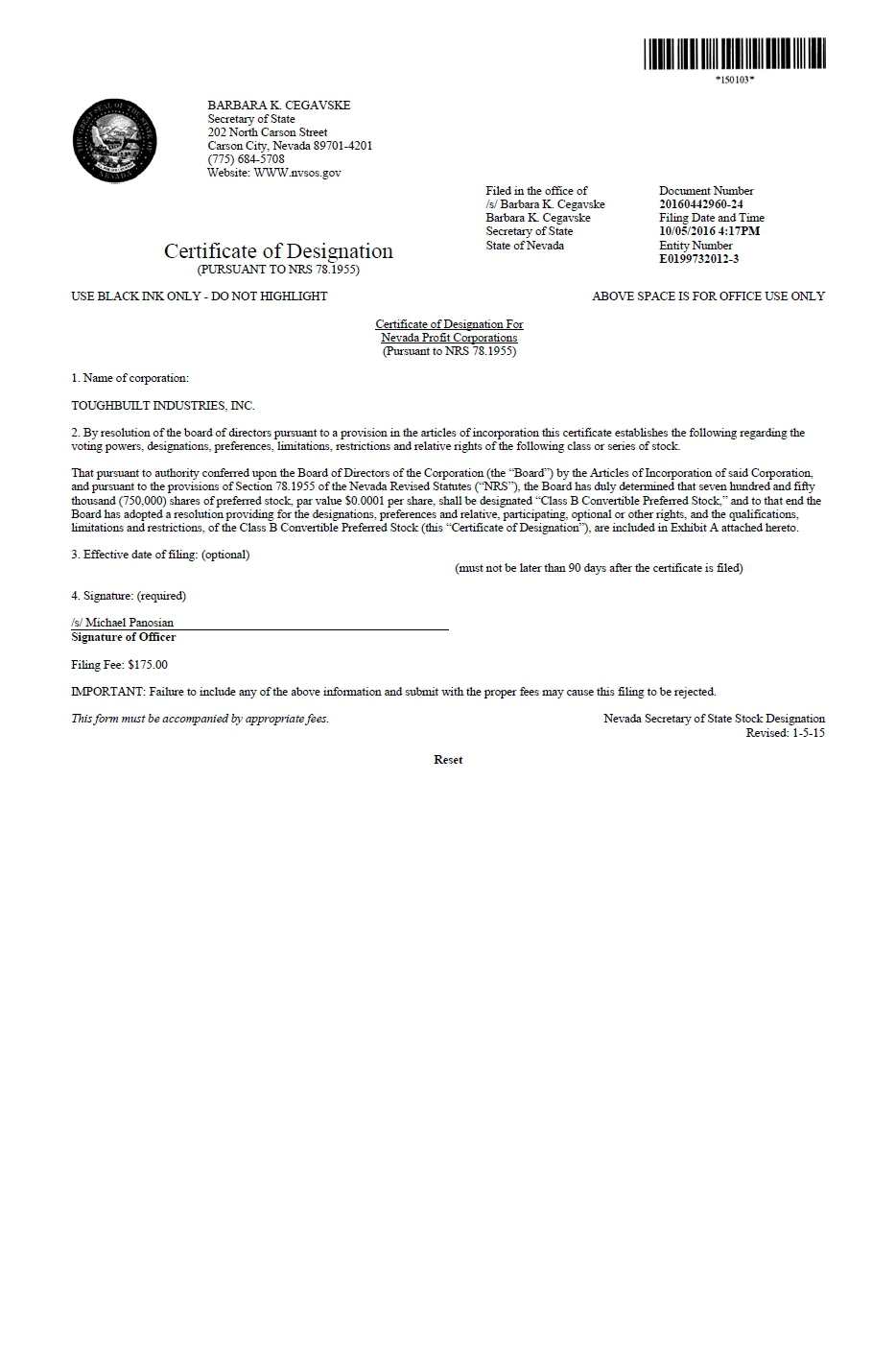 TOUGHBUILT INDUSTRIES, INC., a corporation organized and existing under the Nevada Revised Statutes (the “Corporation”)