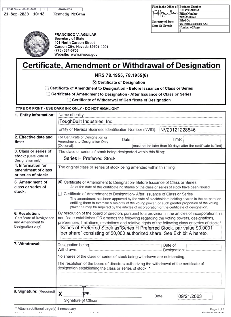 THE UNDERSIGNED, MICHAEL PANOSIAN, DOES HEREBY CERTIFY, on behalf of ToughBuilt Industries, Inc., a Nevada corporation (the “Corporation”), that the following resolution was duly adopted by the board of directors of the Corporation (the “Board”) via written consent in lieu of a meeting on September 21, 2023, which resolution provides for the creation of a series of the Corporation’s Preferred Stock which is designated as “Series H Preferred Stock,” with the rights, powers, and preferences, and the qualifications, limitations, and restrictions thereof, set forth therein.