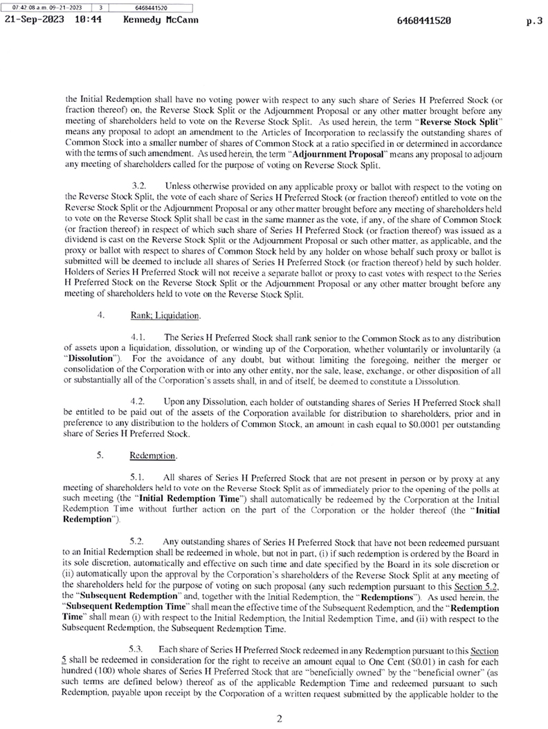 5.4. From and after the time at which any shares of Series H Preferred Stock are called for redemption (whether automatically or otherwise) in accordance with Section 5.1 or Section 5.2, such shares of Series H Preferred Stock shall cease to be outstanding, and the only right of the former holders of such shares of Series H Preferred Stock, as such, will be to receive the applicable redemption price, if any. The shares of Series H Preferred Stock redeemed by the Corporation pursuant to this Certificate of Designation shall not be reissued as shares of Series H Preferred Stock and the Corporation shall take all action necessary to restore such shares to the status of authorized but unissued shares of Preferred Stock. Notwithstanding anything to the contrary herein or otherwise, and for the avoidance of doubt, any shares of Series H Preferred Stock (or fraction thereof) that have been redeemed pursuant to an Initial Redemption shall not be deemed to be outstanding for the purpose of voting or determining the number of votes entitled to vote on any matter submitted to shareholders (including the Reverse Stock Split or any other matter brought before any meeting of shareholders held to vote on the Reverse Stock Split) from and after the time of the Initial Redemption. Notice of any meeting of shareholders for the submission to shareholders of any proposal to approve the Reverse Stock Split shall constitute notice of a redemption of shares of Series H Preferred Stock pursuant to an Initial Redemption and result in the automatic redemption of the applicable shares of Series H Preferred Stock (and/or fractions thereof) pursuant to the Initial Redemption at the Initial Redemption Time pursuant to Section 5.1 hereof. Notice by the Corporation of the shareholders’ approval of the Reverse Stock Split, whether by press release or by filing of a Current Report on Form 8-K with the Securities and Exchange Commission, shall constitute a notice of a redemption of shares of Series H Preferred Stock pursuant to a Subsequent Redemption and result in the automatic redemption of the applicable shares of Series H Preferred Stock (and/or fractions thereof) pursuant to the Subsequent Redemption at the Subsequent Redemption Time pursuant to Section 5.2 hereof. In connection with the filing of this Certificate of Designation, the Corporation has set apart funds for payment for the redemption of all shares of Series H Preferred Stock pursuant to the Redemptions and shall continue to keep such funds apart for such payment through the payment of the purchase price for the redemption of all such shares.