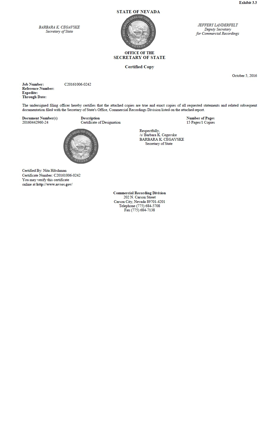 IN WITNESS WHEREOF, the undersigned has executed this Certificate of Designations as of this 4th day of October 2016.