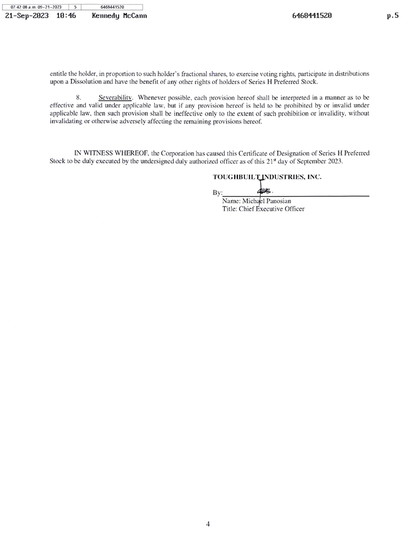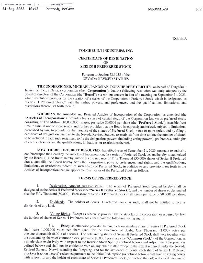 THE UNDERSIGNED, MICHAEL PANOSIAN, DOES HEREBY CERTIFY, on behalf of ToughBuilt Industries, Inc., a Nevada corporation (the “Corporation”), that the following resolution was duly adopted by the board of directors of the Corporation (the “Board”) via written consent in lieu of a meeting on September 21, 2023, which resolution provides for the creation of a series of the Corporation’s Preferred Stock which is designated as “Series H Preferred Stock,” with the rights, powers, and preferences, and the qualifications, limitations, and restrictions thereof, set forth therein.