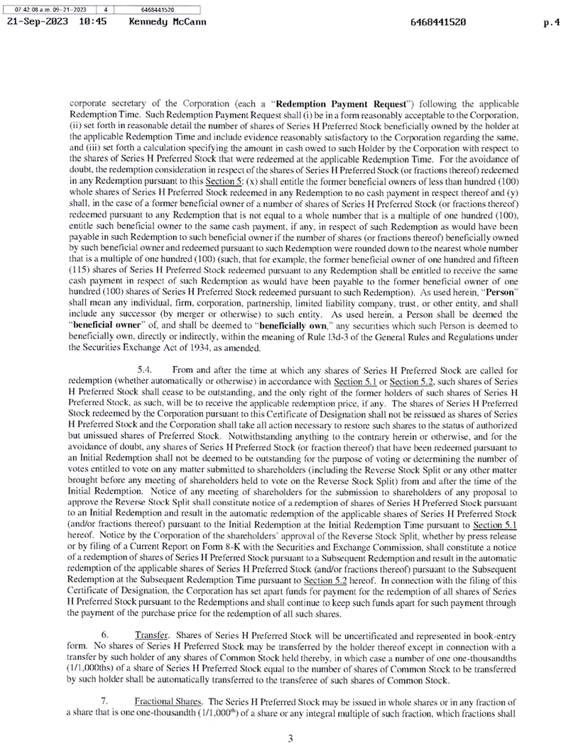 5.4. From and after the time at which any shares of Series H Preferred Stock are called for redemption (whether automatically or otherwise) in accordance with Section 5.1 or Section 5.2, such shares of Series H Preferred Stock shall cease to be outstanding, and the only right of the former holders of such shares of Series H Preferred Stock, as such, will be to receive the applicable redemption price, if any. The shares of Series H Preferred Stock redeemed by the Corporation pursuant to this Certificate of Designation shall not be reissued as shares of Series H Preferred Stock and the Corporation shall take all action necessary to restore such shares to the status of authorized but unissued shares of Preferred Stock. Notwithstanding anything to the contrary herein or otherwise, and for the avoidance of doubt, any shares of Series H Preferred Stock (or fraction thereof) that have been redeemed pursuant to an Initial Redemption shall not be deemed to be outstanding for the purpose of voting or determining the number of votes entitled to vote on any matter submitted to shareholders (including the Reverse Stock Split or any other matter brought before any meeting of shareholders held to vote on the Reverse Stock Split) from and after the time of the Initial Redemption. Notice of any meeting of shareholders for the submission to shareholders of any proposal to approve the Reverse Stock Split shall constitute notice of a redemption of shares of Series H Preferred Stock pursuant to an Initial Redemption and result in the automatic redemption of the applicable shares of Series H Preferred Stock (and/or fractions thereof) pursuant to the Initial Redemption at the Initial Redemption Time pursuant to Section 5.1 hereof. Notice by the Corporation of the shareholders’ approval of the Reverse Stock Split, whether by press release or by filing of a Current Report on Form 8-K with the Securities and Exchange Commission, shall constitute a notice of a redemption of shares of Series H Preferred Stock pursuant to a Subsequent Redemption and result in the automatic redemption of the applicable shares of Series H Preferred Stock (and/or fractions thereof) pursuant to the Subsequent Redemption at the Subsequent Redemption Time pursuant to Section 5.2 hereof. In connection with the filing of this Certificate of Designation, the Corporation has set apart funds for payment for the redemption of all shares of Series H Preferred Stock pursuant to the Redemptions and shall continue to keep such funds apart for such payment through the payment of the purchase price for the redemption of all such shares.